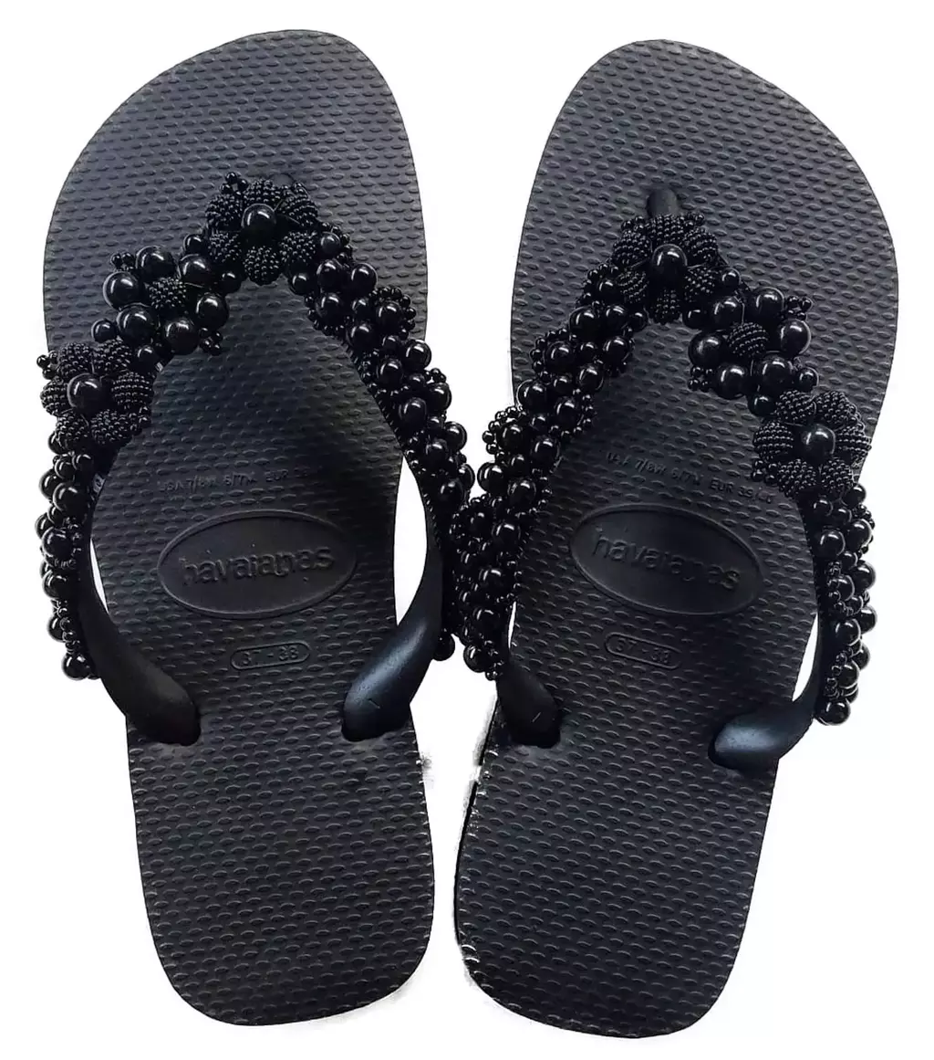 O Chinelo Decorado Havaianas Top Lindas Flores é feito à mão com flores formadas por pérolas aplicadas cuidadosamente, trazendo um visual romântico e sofisticado.